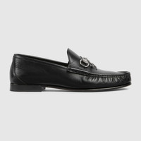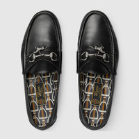 The Horsebit 1953 loafer is embellished with a charm, in addition to the emblematic hardware in silver tone. Crafted in leather, the style combines contemporary edge with classic elegance. - Black leather - Silver-toned hardware - Horse-shaped charm - Leather lining - Horsebit - Padded leather insole with stirrup motif and Gucci crest label - Leather sole - Flat - Height: 0.6"