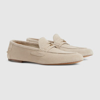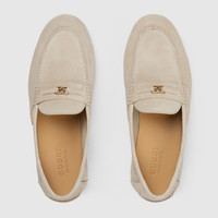 Gucci footwear reinvents traditional designs with unexpected elements. A refined take on Guccio Gucci's monogram embellishes this pair of suede loafers, bringing a subtle touch of definition to the style. - Oatmeal suede - Men's - Gold-toned hardware - Interlocking G - Leather sole - Flat - Made in Italy