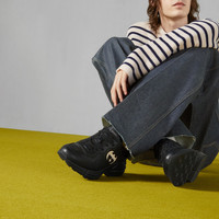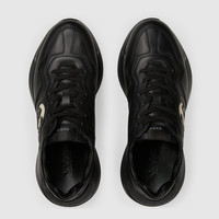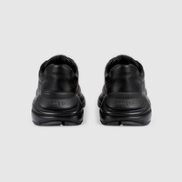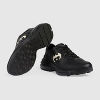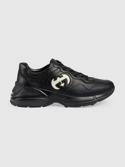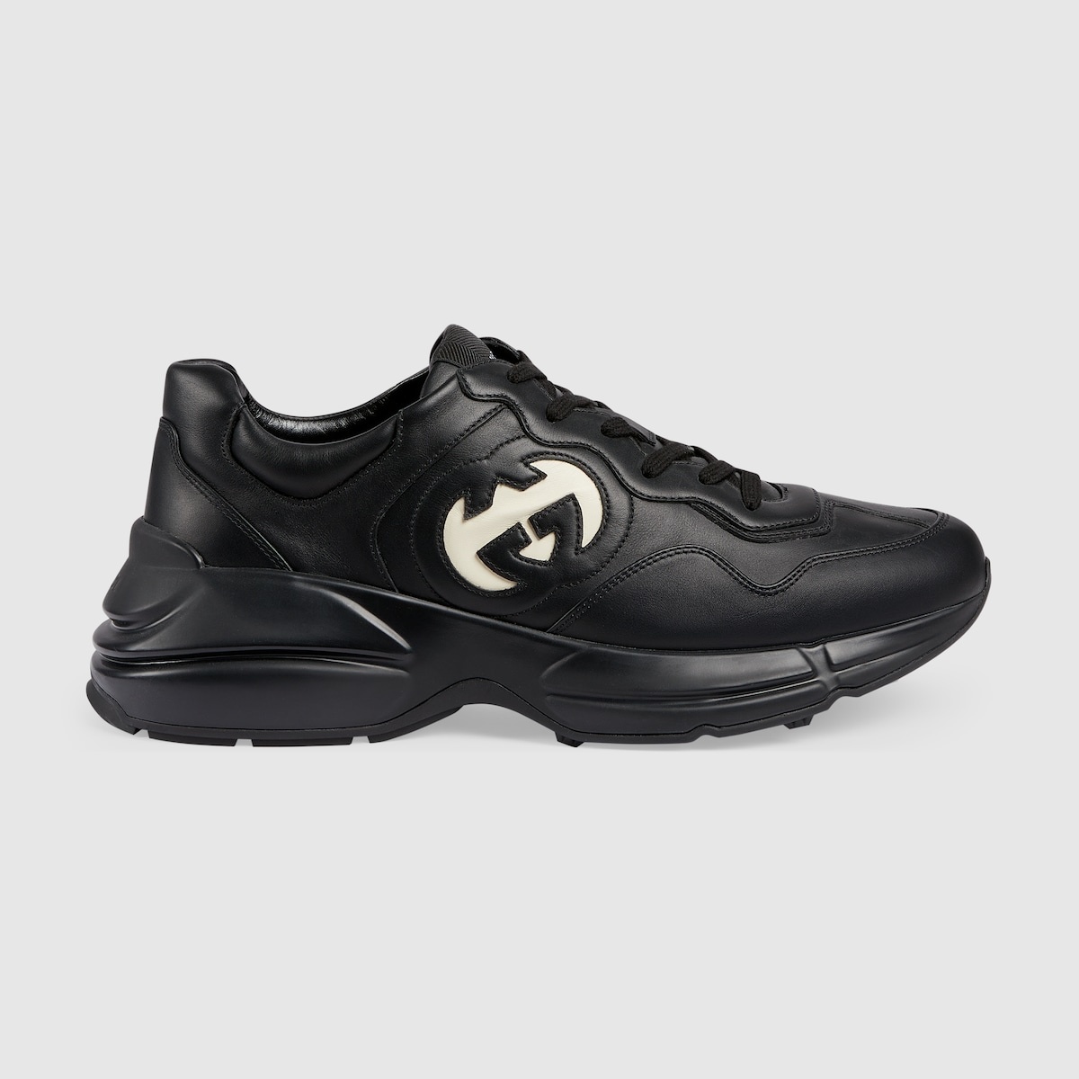 The Rhyton's retro silhouette is presented in black leather. In a contrasting color, the shoe is animated by an Interlocking G cut-out detail, adding a soft logo touch to this emblematic sneaker. - Black leather - Men's - Contrasting Interlocking G cut-out - Gucci logo tag - Rubber sole - Low heel - Lace-up closure - 2.4" height - Made in Italy