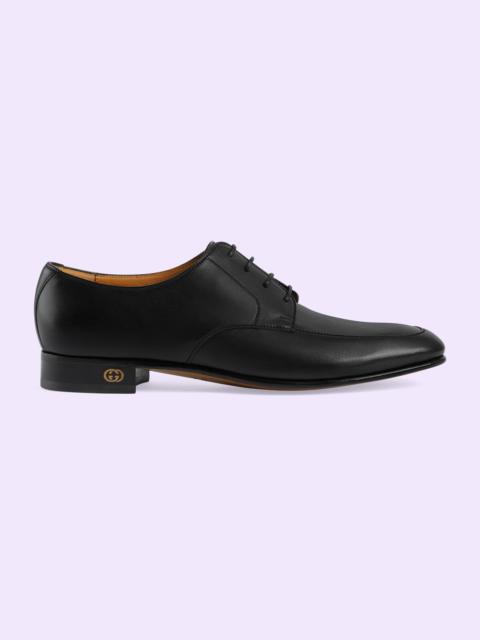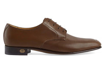 Formal wear continues to be reimagined through the Gucci lens each season. Here, this minimalist shoe is crafted from brown leather and is defined by an Interlocking G on the heel, adding a subtle logo touch to the style. - Brown leather - Men's - Gold-toned Interlocking G logo on the heel - Leather sole - Lace-up closure - Low heel - 1" heel height - Made in Italy