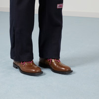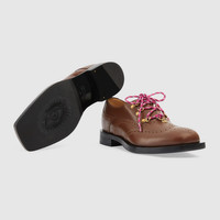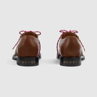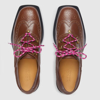 Hybrid designs characterize the latest collections. With a square toe and laces inspired by the world of hiking, these brown leather brogues are presented in shiny black leather with metal logo details. The shoe's refined material and logo detail mixes with elements taken from the world of sports and leisure to create a versatile piece that blends the lines between formal and casual. - Brown leather - Men's - 'Gucci' metal insert at the back - Brogue details - Leather sole - Lace-up closure with metal eyelets - Low heel - 1.2" heel height - Made in Italy