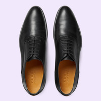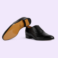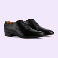 Forming a personal conversation between the wearer and the House, established codes are reimagined in miniature. This pair of shoes is presented in black leather with a petite Double G detail. - Black leather - Men's - Double G detail - Leather sole - Lace-up - Low heel - 1.2" heel height - Made in Italy