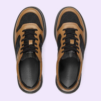 This sneaker's chunky silhouette gives it a playful, retro feel. Gucci's collections continue to look to other eras, finding inspiration in the everyday and bringing them to the present. Crafted from leather and GG canvas, the Gucci detail adds a logo twist. - Camel leather and black GG canvas - Men's - Interlocking G print - 'Gucci' detail on the heel - Rubber sole - Additional pair of laces included - Lace-up closure - Flat - 2.2" height - Made in Italy