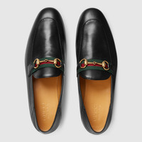 Crafted from soft black leather, the loafer's refined shape is enriched with a combination of two of the House's most distinct codes: the Web stripe and Horsebit. Since the introduction of its classic shape in the 1950s, the preppy-inspired shoe has continued its influence, redesigned in new forms and materials. The foldable back heel gives the classic design a contemporary appeal. - Black leather - Men's - Green and red Web - Horsebit detail - Leather sole - The back is designed to be worn with the heel folded down or up - Flat - .6" heel height - Made in Italy