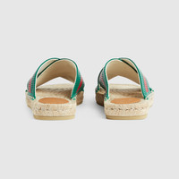 Perforated techniques seen throughout the Pre-Fall 2020 collection add an element of texture to leather styles. The green and red Web is presented as criss cross straps on an espadrille slide sandal. - Green and red Web perforated leather - Men's - Criss cross straps - Gucci embossed leather tag - Cord with rubber sole - .3" height - Materials made in Italy. Shoe constructed in Spain.