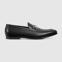 Defined by an elegant silhouette, this man's loafer is crafted in refined leather, spotlighting a GG leather insert, and is completed by the iconic Horsebit with a silver finish. - Black leather - Men's - Silver-toned hardware - Black GG leather insert - Horsebit - Leather sole - Flat - Height: 0.1" - Made in Italy