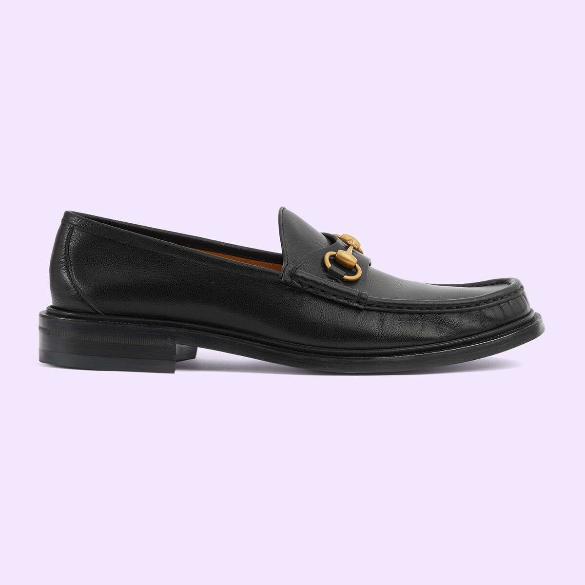 Modern interpretations of archival symbols both pay tribute to Gucci's heritage while looking towards the future. This pair of black leather loafers reimagines the emblematic Horsebit loafer with a low heel and square toe. The gold-toned detail is a direct link to the House's beginnings in the world of sports and leisure. - Black leather - Men's - Gold-toned hardware - Horsebit - Leather sole - Low heel - 1" heel height with .4" platform, based on a size 43 (IT) - Made in Italy
