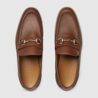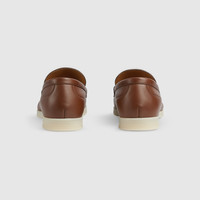 A versatile and timeless piece for any wardrobe, the new rubber sole loafer has an essential design enriched with the iconic Horsebit detail. This variation appears in brown leather with a neutral base. - Brown leather - Men's - Horsebit - Rubber sole - Embossed Gucci detail on sole - Made in Italy