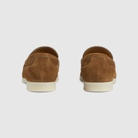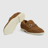 A versatile and timeless piece for any wardrobe, the new rubber sole loafer has an essential design enriched with the iconic Horsebit detail. This variation appears in a brown suede with a neutral base. - Brown suede - Men's - Horsebit - Rubber sole - Embossed Gucci detail on sole - Made in Italy