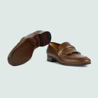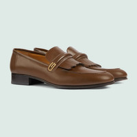 Now an emblem of the brand, the leather loafer is both a statement piece and a classic accessory. A historic shoe that appears throughout the House's collections, the style reflects the preppy narrative animates designs. Here, the silhouette is crafted in brown leather and defined by the mirrored G detail. - Brown leather - Men's - Gold-toned hardware - Mirrored G detail - Fringe detail - Leather sole - Low heel - Made in Italy