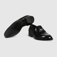 The men's shoe collection presents timeless designs with intricate craftsmanship details. Crafted from smooth, polished leather, this loafer with a semi-pointed toe highlights topstitching on the upper, embellished with a discreet metal logo plate. - Black leather - Leather lining - Gucci logo metal plate - Semi-pointed toe with topstitch detail - Padded leather insole - Leather sole - Slip-on - Flat - Height: 0.8"