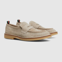 The green and red Web, a distinctive House code, embellishes this men's loafer style crafted in GG suede. The style is completed by a rubber sole for maximum comfort. - Oatmeal GG suede - Web puller tag - Rubber sole - Flat - Height: 0.5" - Made in Italy