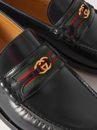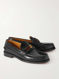 The striped webbing and gold-tone monogram hardware on these 'Kaveh' loafers have been Gucci hallmarks for a very long time, so you won't have to worry about them dating. Made in Italy (of course), the uppers, linings and soles are all constructed from leather, and the latter is tipped with rubber for grip. Size & Fit - Fits true to size. Take your normal size - UK sizing Details & Care - Black leather (Calf) - Gold-tone designer emblems, webbing trims, leather linings, rubber-tipped leather soles