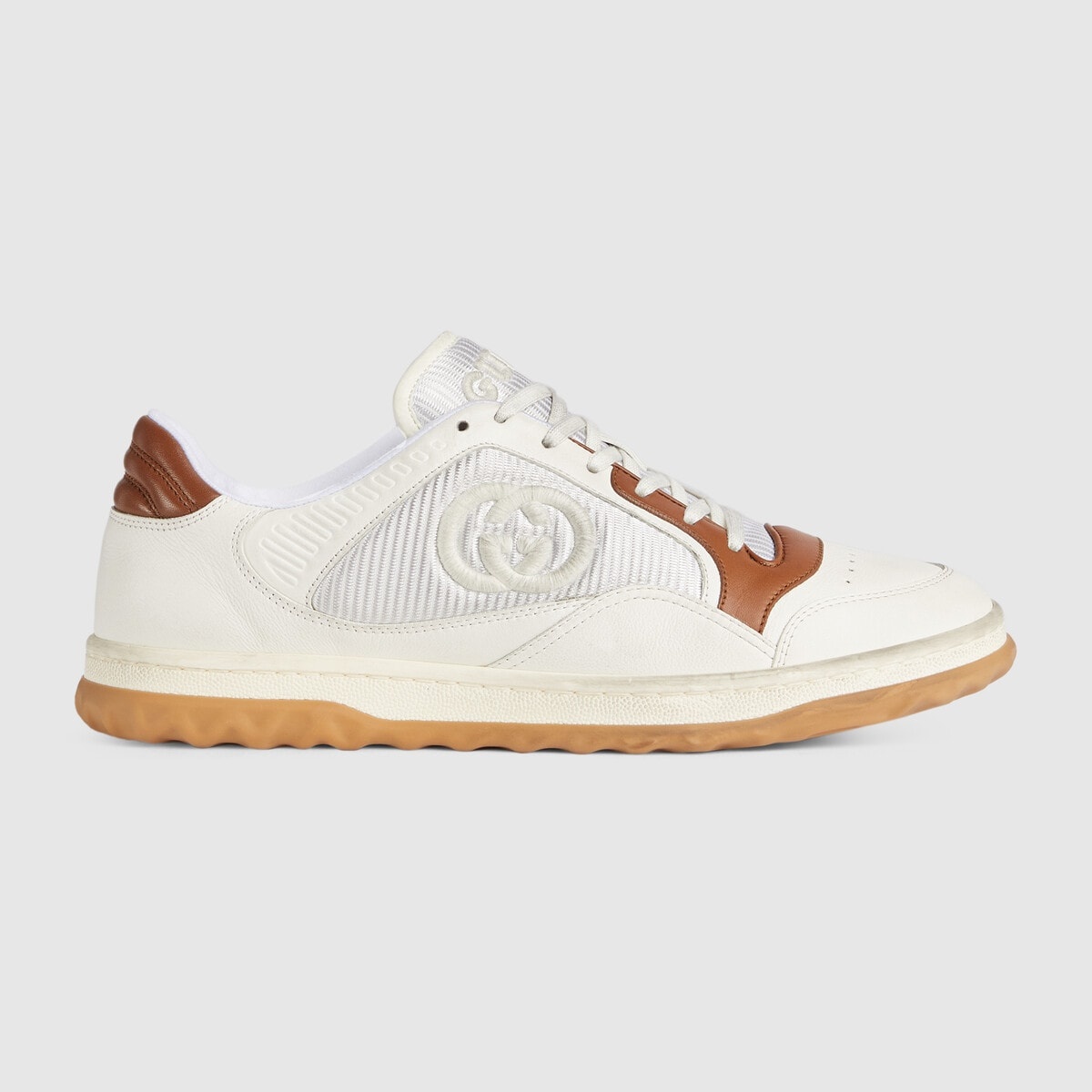 A discreet Interlocking G speaks to the subtle narrative that runs through the collection. Presented against off white leather, the motif brings the House logo to the fore in this retro-inspired sneaker design. - Off white and brown leather - Men's - Off white fabric insert - Interlocking G embroidery - Round toe - Rubber sole - Gucci embroidery - Additional pair of laces included - Lace-up closure - Flat - 1.2" heel height - Made in Italy - Treated for a distressed effect, these shoes undergo a dedicated aging process which makes each product unique and the final color may vary from the photo.