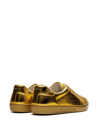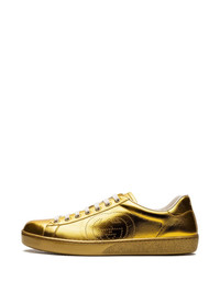 The Interlocking G appears as a perforated detail atop this sneaker. Each season the House's emblematic codes and styles come together, seen through the lens of the latest collection. Here, the emblematic Ace sneaker is paired with the monogram in an ode to both Gucci's past and present. - Gold metallic leather - Men's - Perforated Interlocking G detail - Rubber sole - These shoes run big, we recommend sizing down one size - .6" height - Made in Italy