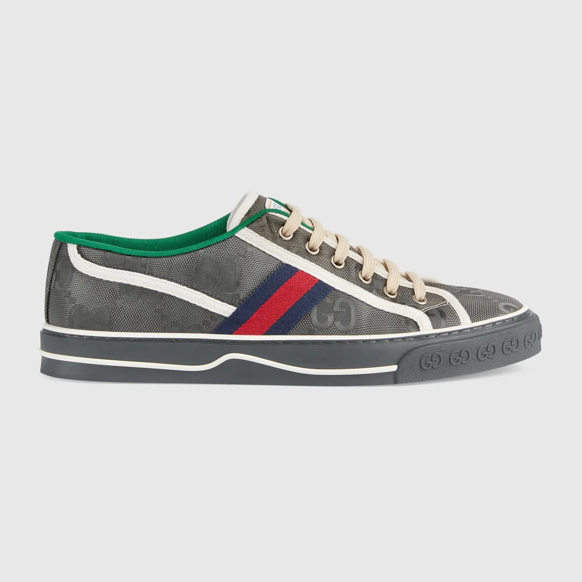Supporting the House's commitment to sustainability, this pair of Gucci Tennis 1977 sneakers is part of a line of accessories and ready-to-wear made from recycled materials and trims. Gucci Off The Grid is the first collection from Gucci Circular Lines—a concept created to support the House's vision for circular production. Designed for those mindful of their environmental impact, Gucci Off The Grid uses recycled, organic, bio-based and sustainably sourced materials. - Dark grey GG nylon made from ECONYL®—a nylon fabric sourced from regenerated materials (from fish nets, carpets and other scraps) that can be recycled and recreated, aiding in decreasing its ecological footprint - Men's - Blue and red Web - White contrast details - Gucci Tennis 1977 label made from recycled polyester - TPU Sole made with 20% bio-based content instead of non-renewable fossil sources. - GG motif at the sole - Flat - 0.8" height - Made in Italy