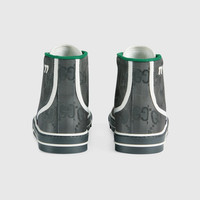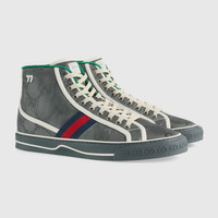Supporting the House's commitment to sustainability, this pair of Gucci Tennis 1977 sneakers is part of a line of accessories and ready-to-wear made from recycled materials and trims. Gucci Off The Grid is the first collection from Gucci Circular Lines—a concept created to support the House's vision for circular production. Designed for those mindful of their environmental impact, Gucci Off The Grid uses recycled, organic, bio-based and sustainably sourced materials. - Dark grey GG nylon made from ECONYL®—a nylon fabric sourced from regenerated materials (from fish nets, carpets and other scraps) that can be recycled and recreated, aiding in decreasing its ecological footprint - Men's - Blue and red Web - White contrast details - Gucci Tennis 1977 label made from recycled polyester - GG motif at the sole - "77" embroidery - Rubber sole - Flat - 0.8" height - Made in Italy