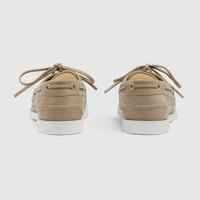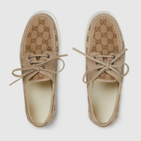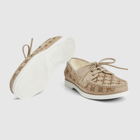 Inspired by the summer spirit and beach clubs on the Italian coast, this item is part of Gucci Lido. Emblematic codes of the House and refined patterns are reinterpreted in contemporary ways for the Pre-Fall collection. This pair of loafers are presented in beige and ebony Original GG canvas, making for a striking seasonal addition to your wardrobe. - Beige and ebony Original GG canvas - Men's - Beige leather trim - Rubber sole - Eyelets on shoe collar - Leather laces - Flat - Heel height: 0.5" - Made in Italy