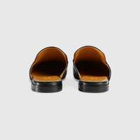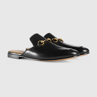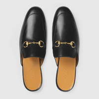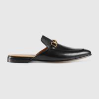 Soft leather slipper with our symbolic gold-tone Horsebit detail. - Black leather - Leather sole - Flat - .4" heel height - Made in Italy - These shoes run small, we recommend sizing up half a size - Please refer to the size guide to find the best fit