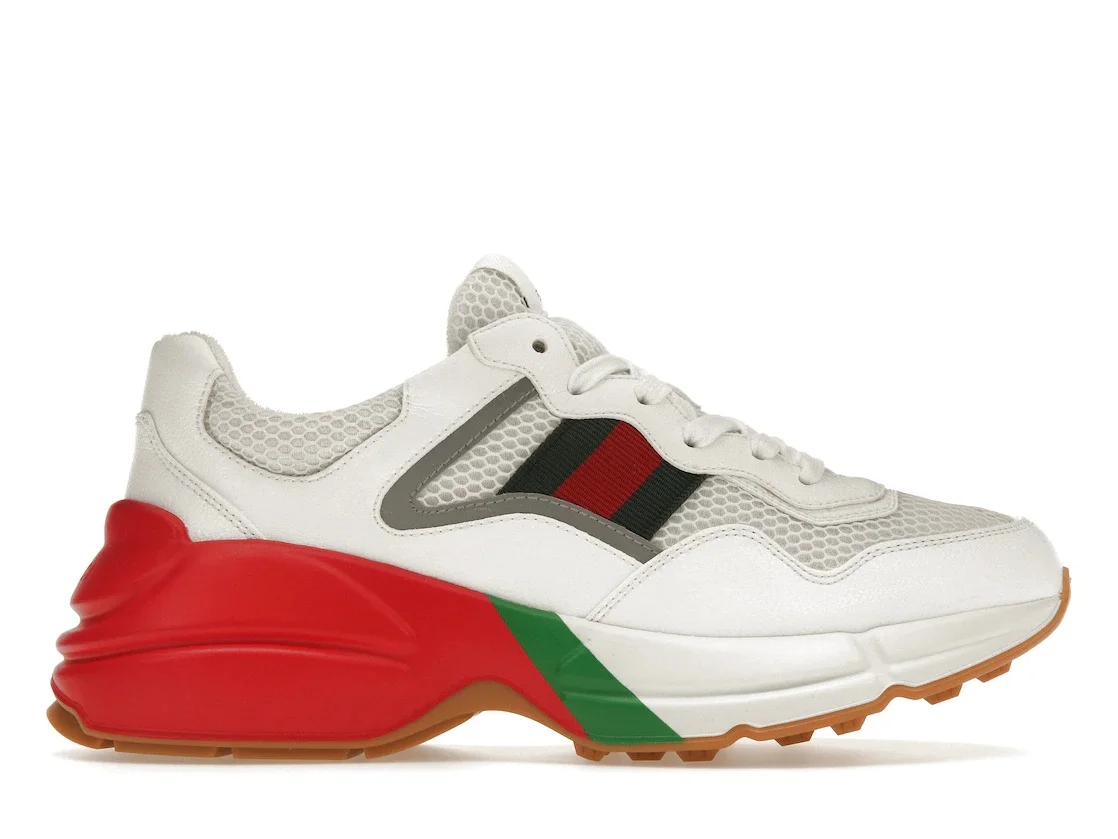 With its recognizable oversized sole and chunky construction, the Rhyton is introduced in leather effect fabric in contrasting colors. A message about leaving fashion’s old rules behind, the Epilogue collection conveys the idea that pieces should be timeless–not just in fashion for one season. Speaking to this theme, signature House styles are reimagined in new ways. - White leather effect fabric, white mesh and gray reflective fabric - Green and red Web - Men's - Rubber sole - Gucci logo tag - Low heel - 2" height - Made in Italy