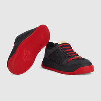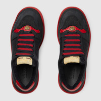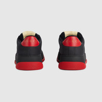 The Pre-Fall 2023 collection captures the essence of Gucci. Colors, prints, and emblems appear consistently across time-honored designs, demonstrating the House's ability to reinvent signature pieces season after season. Part of the selection, this pair of Screener sneakers is crafted from black Original GG canvas and features red leather details. - Black Original GG canvas - Men's - Black suede trim - Red leather details - Oval enameled detail with metal Double G - Label with Gucci vintage logo - Bi-color flatform sole - Chunky laces - Additional pair of laces included - Low heel - 2" height - Made in Italy