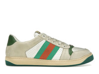 A pastiche of different influences that span across decades, the Cruise 2019 collection references old school shapes and materials inspired by vintage sportswear. Influenced by classic trainers from the '70s, the Screener sneakers—named for the defensive sports move—feature the Web stripe on the side and vintage Gucci logo, treated for an allover distressed effect. - White perforated and off-white leather - Green and orange Web with vintage effect - Green leather details - Treated for a vintage, distressed effect - Oval enameled detail with metal Double G - Label with Gucci vintage logo - Bi-color sole - Low heel - 1.4" height - Made in Italy - Treated for a distressed effect, these shoes undergo a dedicated aging process which makes each product unique and the final colour may vary from the photo.