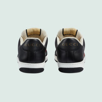 Influenced by classic trainers from the '70s, the Screener sneakers—named for the defensive sports move—feature the Web stripe on the side and the vintage Gucci logo. Here the style is presented in black and white leather, while the House's monogram continues to appear as a subtle enamel and metal detail. - Black and white leather - Men's - Green and red Web - Oval enameled detail with metal Double G - Label with Gucci vintage logo - Bi-color sole - Additional pair of laces included - Low heel - 1.4" height - Made in Italy