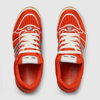 Inspired by the summer spirit and beach clubs on the Italian coast, this item is part of Gucci Lido. Inspired by classic trainers from the 1970s, the Screener sneaker is named after a defensive move in sports. For Pre-Fall 2024, this style is crafted in orange neoprene, a technical yet malleable material with an opaque appearance, featuring the Web stripe on the side and embossed Gucci logo on the heel. - Orange neoprene, with an opaque and technical appearance - Men's - Blue and red Web - Oval enameled detail with metal Double G - Embossed Gucci logo - Additional pair of laces included - Lace-up closure - Low heel - Made in Italy