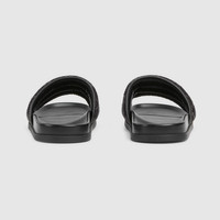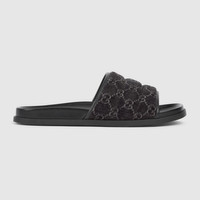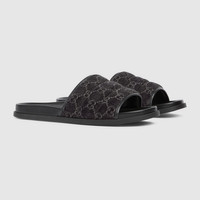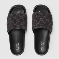 This pair of slide sandals is crafted from washed-effect GG denim, which subtly depicts the monogram motif on the timeless material. The upper part is padded and defines this stylish accessory. - Black washed-effect GG denim - Fabric lining - GG rubber sole - Flat - Made in Italy