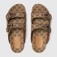 A pair of flat sandals crafted from monogram canvas in beige and ebony. First used in the 1970s, the GG logo was an evolution of the original Gucci rhombi design from the 1930s, and from then it's been an established symbol of Gucci's heritage. - Beige and ebony Original GG canvas - Men's - Rubber sole - Strap closure with buckles - Low heel - 1" height - Made in Italy