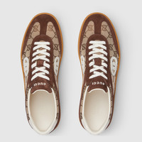 This pair of shoes is crafted from supple suede, exuding a sophisticated yet modern appeal. The streamlined silhouette is elegantly enhanced by the signature Interlocking G logo, adding a refined touch to the design. - Dark brown suede - Men's - Beige and dark brown GG canvas - Leather lining - Interlocking G logo - Additional pair of laces included - Lace-up closure - Flat - Heigth: 0.1" - Made in Italy