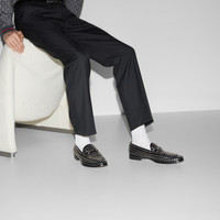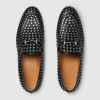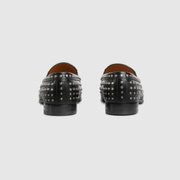 The Horsebit motif continues to enrich the latest collections of the House. Here, it enriches a classic loafer silhouette in black leather. Allover metal studs complete the style, adding a soft punk statement feel. - Black leather - Men's - Silver-toned hardware - Metal studs allover - Horsebit - Leather sole - Low heel - Height: 0.9" - Made in Italy