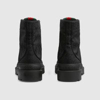 This pair of men's ankle boots is crafted in the emblematic GG canvas, while the construction is defined by a rubber lug sole. This versatile yet unique design highlights the House's monogram in a subtle and iconic way. - Black GG canvas - Men's - Leather lining - Web tongue - Rubber lug sole - Rubber covered toe cap - Lace-up closure - Flat - Height: 0.5" - Made in Italy