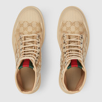 This pair of men's ankle boots is crafted in the emblematic GG canvas, while the construction is defined by a rubber lug sole. This versatile yet unique design highlights the House's monogram in a subtle and iconic way. - Beige GG canvas - Men's - Leather lining - Web tongue - Rubber lug sole - Rubber covered toe cap - Lace-up closure - Flat - Height: 0.5" - Made in Italy