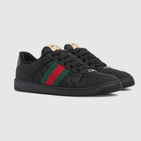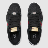 Introducing Spring Summer 2026. The Screener sneaker, which takes its name from a sports move, continues to blend unexpected material and color combinations. Crafted from GG canvas, this style has been treated by hand to achieve a worn-out appearance for the La Famiglia collection. - Black GG canvas, with worn-out effect created by hand - Leather lining - Oval enameled detail with metal Double G - Label with Gucci vintage logo - Rubber sole - Lace-up closure - Flat - Height: 0.4" - Made in Italy