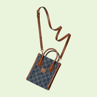 GG denim, a signature material seen both in the handbags and ready-to-wear selections. Here the unmistakable jacquard returns as part of the Gucci Love Parade collection, enriching classic luggage styles with the allover motif. A brown leather trim completes this mini tote bag. - Blue and ivory GG denim jacquard - Brown leather trim - Cotton linen lining - Oval leather Interlocking G tag - Inside: 1 card slot - Handle drop: 2.75" - Detachable shoulder strap with 22" length - 6.3"W x 7.8"H x 2.75"D - Made in Italy - Weight: 435.gr