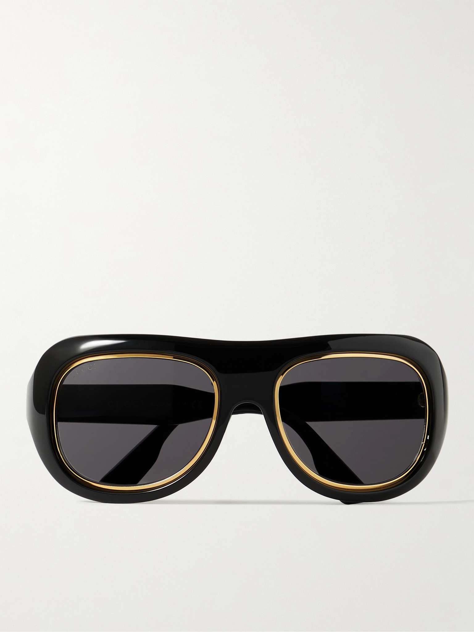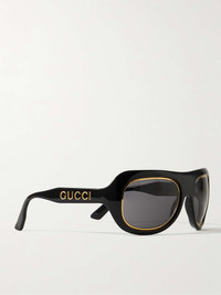 Gucci Eyewear's 'Navigator' sunglasses have a bold, contemporary look. Detailed with a signature logo along the arms, they've been made in Italy from thick black acetate and trimmed with gold-tone metal around the rims in a style that recalls aviator goggles. Size & Fit - Black acetate, gold-tone metal - Black lenses - Come with a case - 100% UV protection - Frame Width: 16.5cm / 6.5in - Frame Height: 5.5cm / 2.2in Details & Care - Black acetate, gold-tone metal - Come with a case - 100% UV protection - Made in Italy
