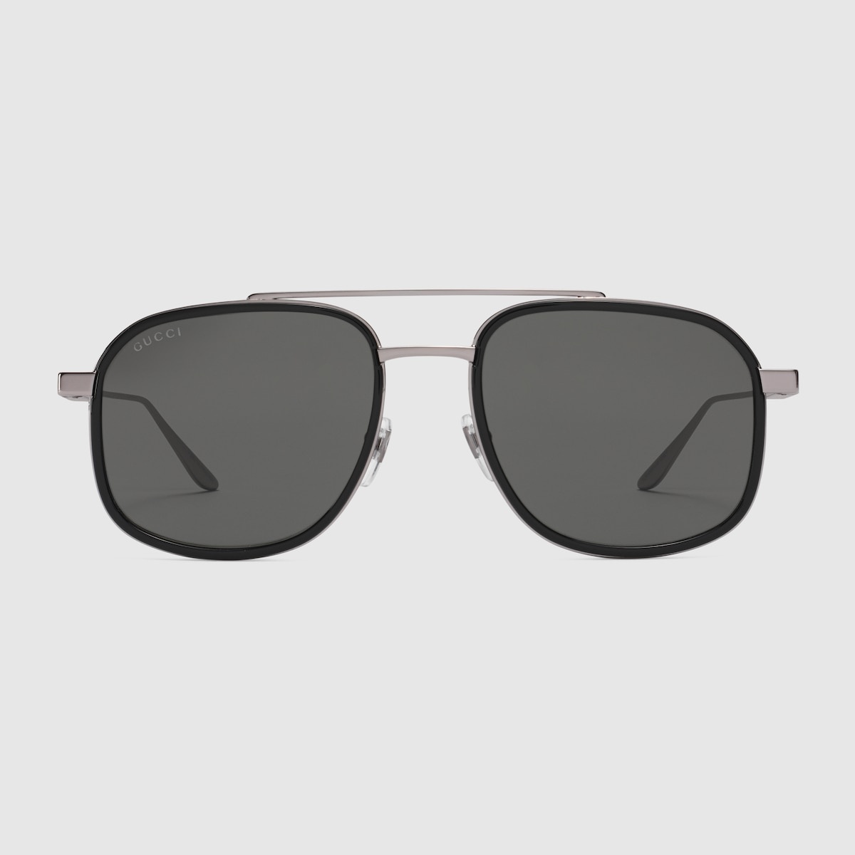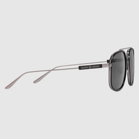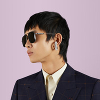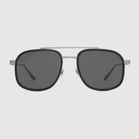 These '80s inspired aviator frames are defined by a minimalistic shape in a dark grey metal frame. A soft grey lens offers an understated chic appeal. - Shiny dark grey metal frame - Shiny dark grey metal temples with Interlocking G and Web - Grey lens - 100% UVA/UVB protection - GG1310S - Temple length: 5.7"; Lens height: 1.8"; Nose bridge length: 0.7" - Frame height: 2"; Frame width: 5.8" - Made in Japan - The glasses will arrive in a velvet case, available in a range of six jewel-toned colors and paired with a coordinating satin lining. The case color will be individually selected for each pair of glasses and comes with a matching satin flannel pouch and ivory microfiber cloth.