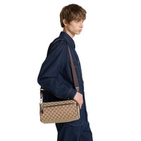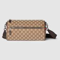 Part of the Pre-Fall 2025 collection, the men's bag selection blends sleek lines with heritage emblems. This item is presented in a beige and brown GG canvas and completed with a green and red Web detail. - Beige and dark brown GG canvas - Dark brown leather trim - Green and red Web detail - Nylon lining - Triangular-shaped side - Inside: 1 leather open pocket - Outside: 1 zip pocket - Detachable and adjustable shoulder strap with 21.6" drop - Zip closure - 11.8"W x 6.2"H x 6.2"D - Weight: 1.3lbs, approximately - Made in Italy
