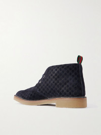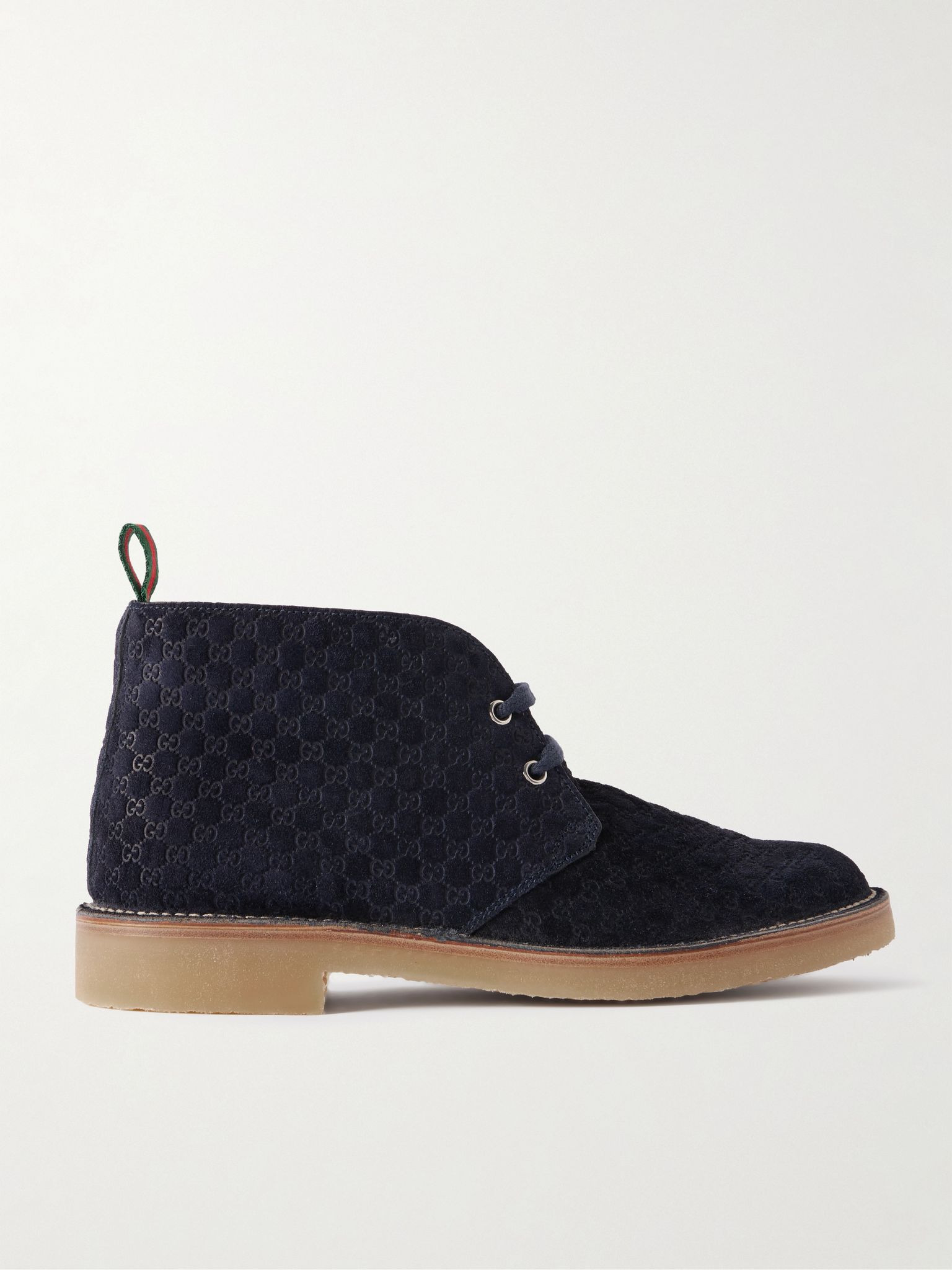 Gucci's boots are modelled on classic military chukkas. Set on gripped rubber-crepe soles, they've been made in Italy from logo-debossed suede and have grosgrain pull tabs in signature red and green shades. Size & Fit - Fits true to size. Take your normal size - Only available in full sizes, go down to the nearest whole size if you take a half size - UK sizing Details & Care - Blue suede (Calf) - Lace-up