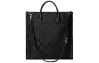 A line of accessories and ready-to-wear is presented for Pre-Fall 2020 made from recycled materials and trims, supporting the House's commitment to sustainability. Gucci Off The Grid is the first collection from Gucci Circular Lines—a concept created to support the House's vision for circular production. Designed for those mindful of their environmental impact, Gucci Off The Grid uses recycled, organic, bio-based and sustainably sourced materials. Regenerated nylon, crafted using recycled sewing thread and trims displays the GG pattern against an opaque background in black. Crafted into a long double handled tote bag, the shape is finished with an optional shoulder strap that can be detached on one side and stored within the bag. - Black GG nylon made from ECONYL®—a nylon fabric sourced from regenerated materials that can be recycled and recreated, aiding in decreasing its ecological footprint - Black leather trims made from leather tanned through an alternative metal or chrome free tanning process, reducing the environmental footprint compared to traditional methods - Palladium-toned metal hardware made from recycled brass alloys with nickel-free finishes - Ribbon trims made from recycled materials - Sewn using recycled polyester thread - Regenerated nylon lining - This item will come with a FSC-certified recycled gift box, shipped flat, and recycled nylon flannel dust bag. Each Gucci Off The Grid product will ship with a dedicated booklet detailing the collection, printed on FSC-certified recycled paper. - Leather detail with Gucci script logo - Interior: 2 zip pockets - Leather top handles with 3.2" drop; Adjustable leather shoulder strap with 14.6" drop can be detached on one side and tucked into bag - Metal hook closure - 14.8"W x 14.6"H x 5.1"D - Weight: 2.2lbs - Made in Italy