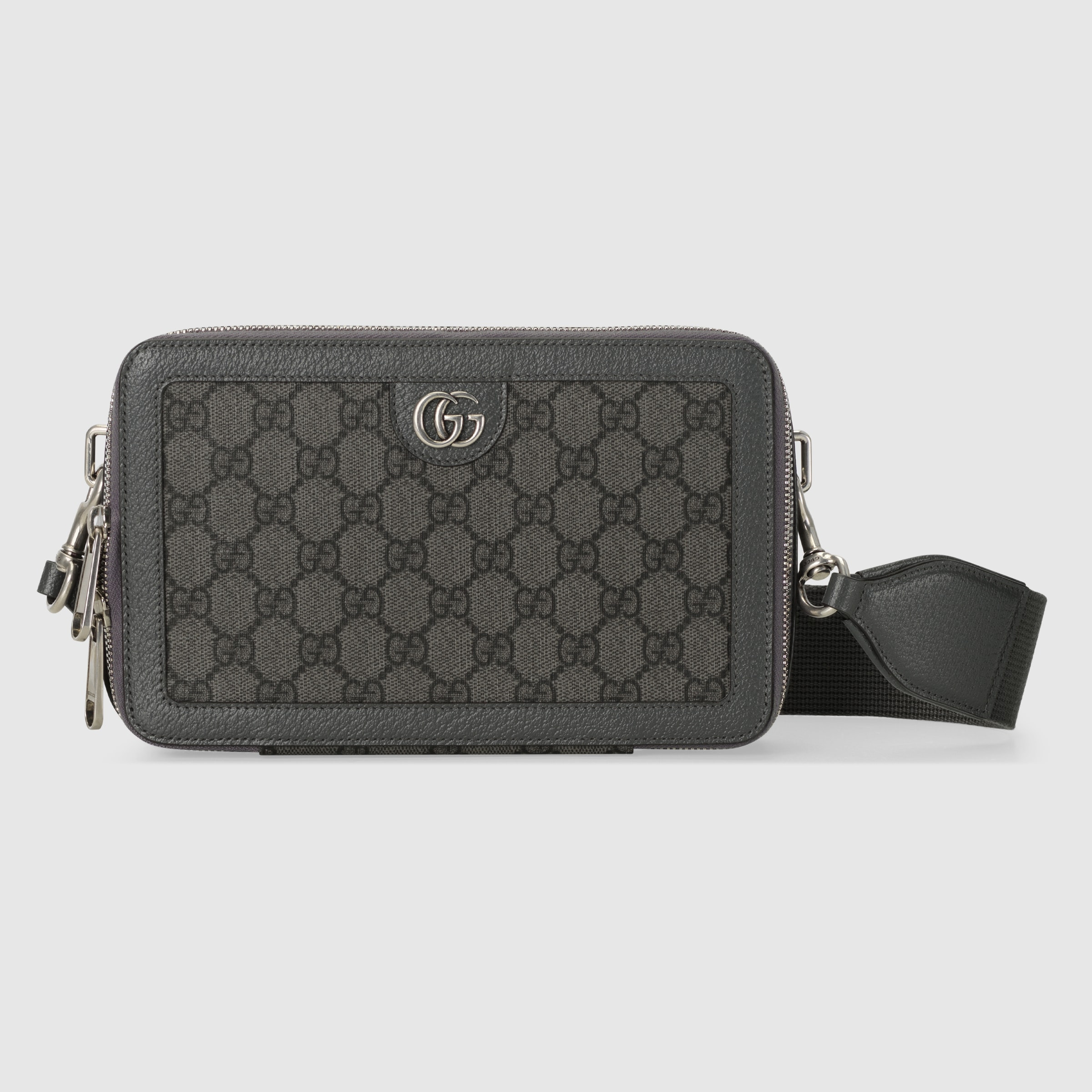 Gucci heritage meets contemporary design with the continuation of Ophidia. With its two archival details, the GG canvas and the Double G hardware, the line takes on new shapes and dimensions in the Pre-Fall collection. This mini bag variation appears in grey and black Supreme canvas with a palladium-toned hardware. - Grey and black GG Supreme canvas - Grey leather trim - Palladium-toned hardware - Moirè and cotton linen lining - Double G - Detachable canvas shoulder strap - Zip closure - 9.4"W x 5.7"H x 2.3"D - Made in Italy