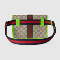Reflecting the Creative Director's contemporary vision, the Ophidia lines come to life with a pop of fluorescent green. Combining the GG motif and Web stripe with a modern hue launches signature travel pieces into the metropolis, such as this small belt bag. - Beige and ebony GG Supreme canvas - Bright green leather trim - Gold-toned hardware - Green and red Web - Blue and red Web on waist belt - Cotton linen lining - Double G - Adjustable waist belt with 20.5" drop and 31.9" - Flap and magnetic snap closure - 9.4"W x 6.7"H x 1.4"D - Made in Italy - Weight: 0.82lbs approximately
