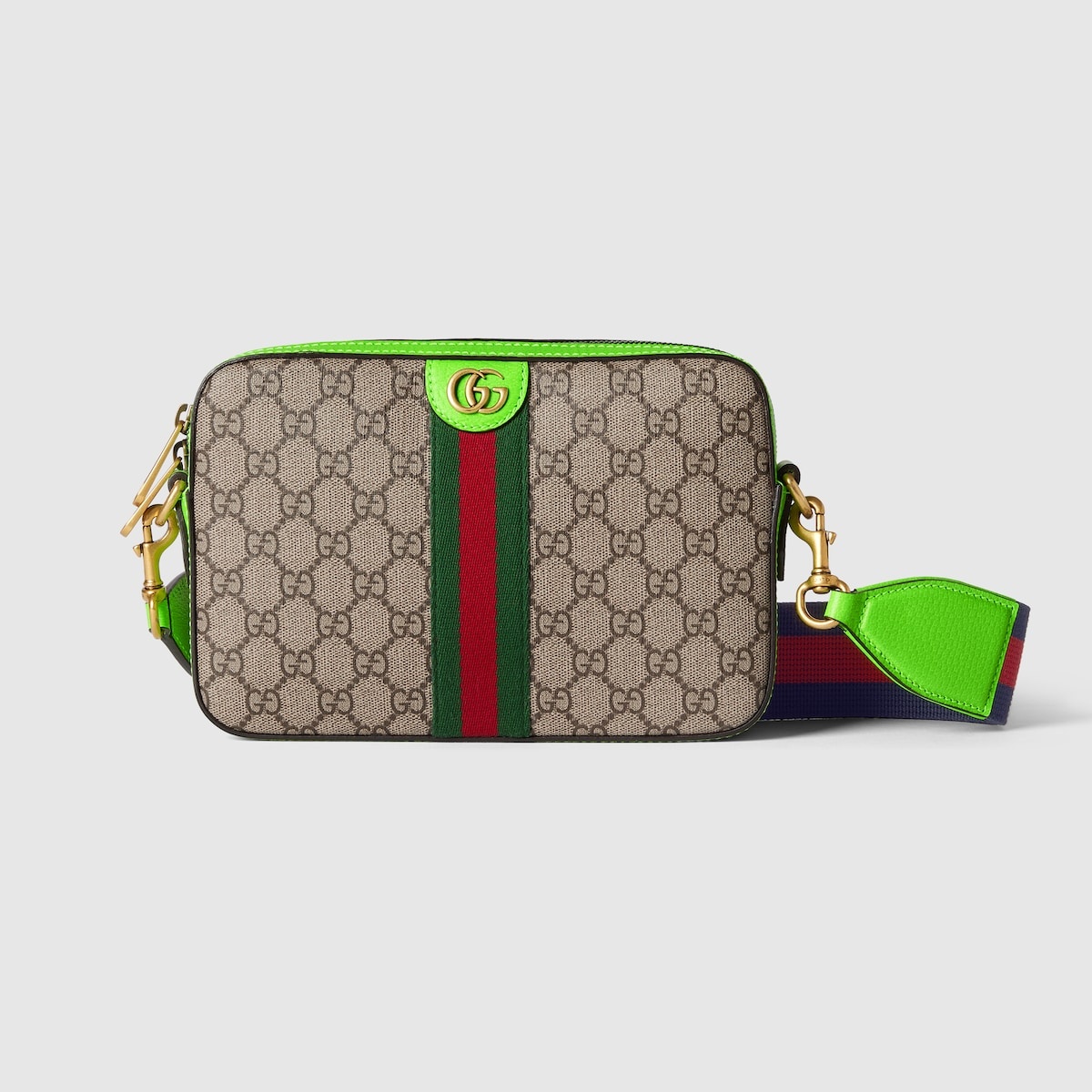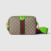 Reflecting the Creative Director's contemporary vision, the Ophidia lines come to life with a pop of fluorescent green. Combining the GG motif and Web stripe with a modern hue launches signature travel pieces into the metropolis, such as this crossbody bag complete with a second Web detail. - Beige and ebony GG Supreme canvas - Bright green leather trim - Gold-toned hardware - Green and red Web - Blue and red Web on strap - Cotton linen lining - Double G - Inside: 1 zip pocket - Shoulder strap with 19.7" drop; length: 37"-53.1" - Zip closure - 9.2"W x 6.3"H x 1.8"D - Made in Italy - Weight: 0.68kg