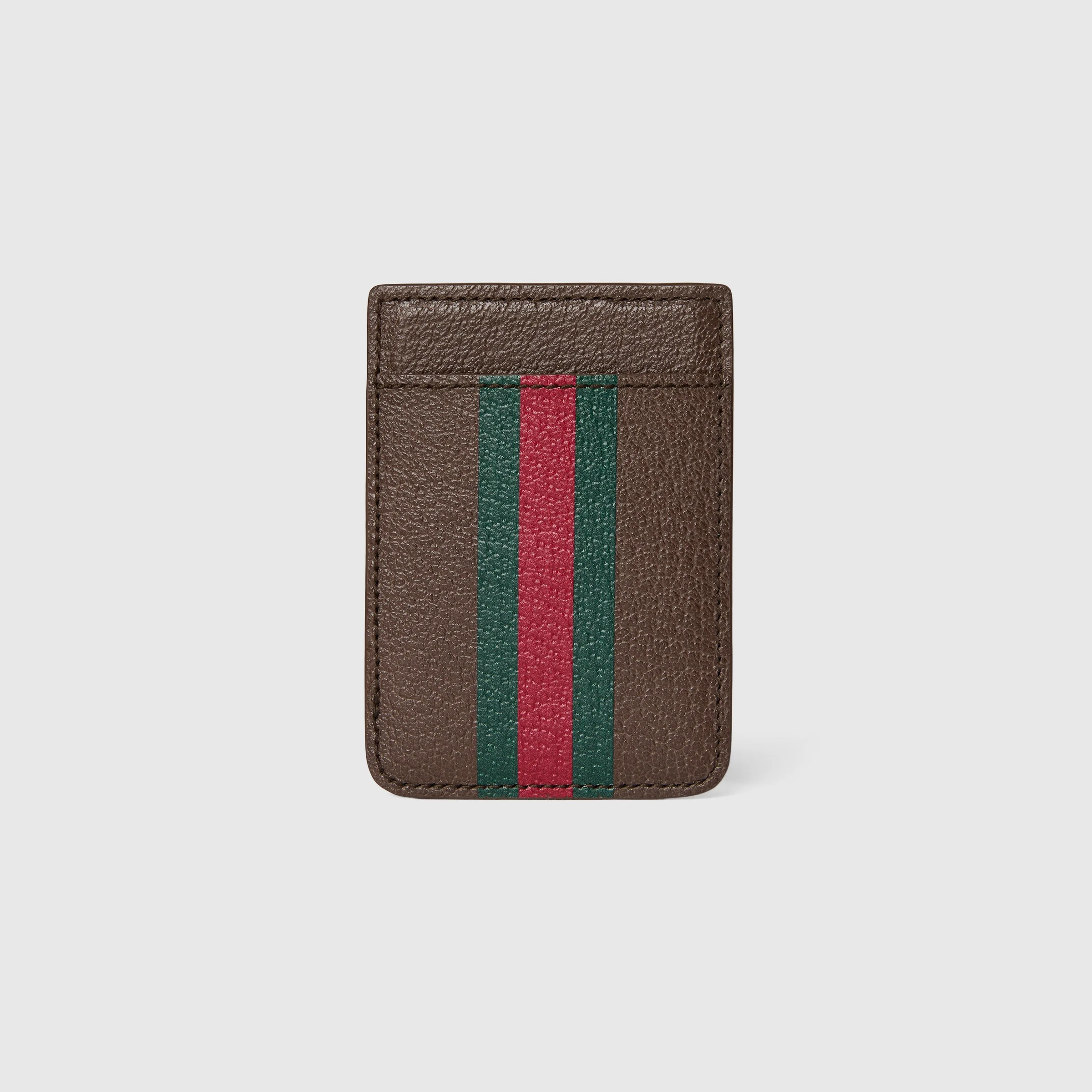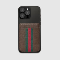 The Ophidia collection evokes the House’s heritage with the signature Web stripe and Double G emblem in light gold-toned finish. The styles are crafted from soft GG Monogram coated fabric, featuring green cotton lining inside. - Brown leather - Brown taffeta lining - Web - The magnetic function works on all iPhone models with MagSafe feature - 1 card slot - W2.6" x H3.7" - Weight: 0.09lbs approximately - Made in Italy