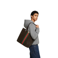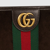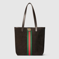 Ophidia offers signature silhouettes and functions crafted with a sophisticated touch. This tote features a soft, lightweight suede, a Double G, as well as green and red Web detail. - Dark brown lightweight soft suede - Gold-toned hardware - Brown cotton linen lining - Double G - Web detail - Inside: 1 flat zip pocket - Handle drop: 11.8" - 11.8"W x 14.1"H x 4.9"D - Weight: 1.7lbs, approximately - Made in Italy - Fits a laptop, iPad, A4 notebook, iPhone Plus & other small items