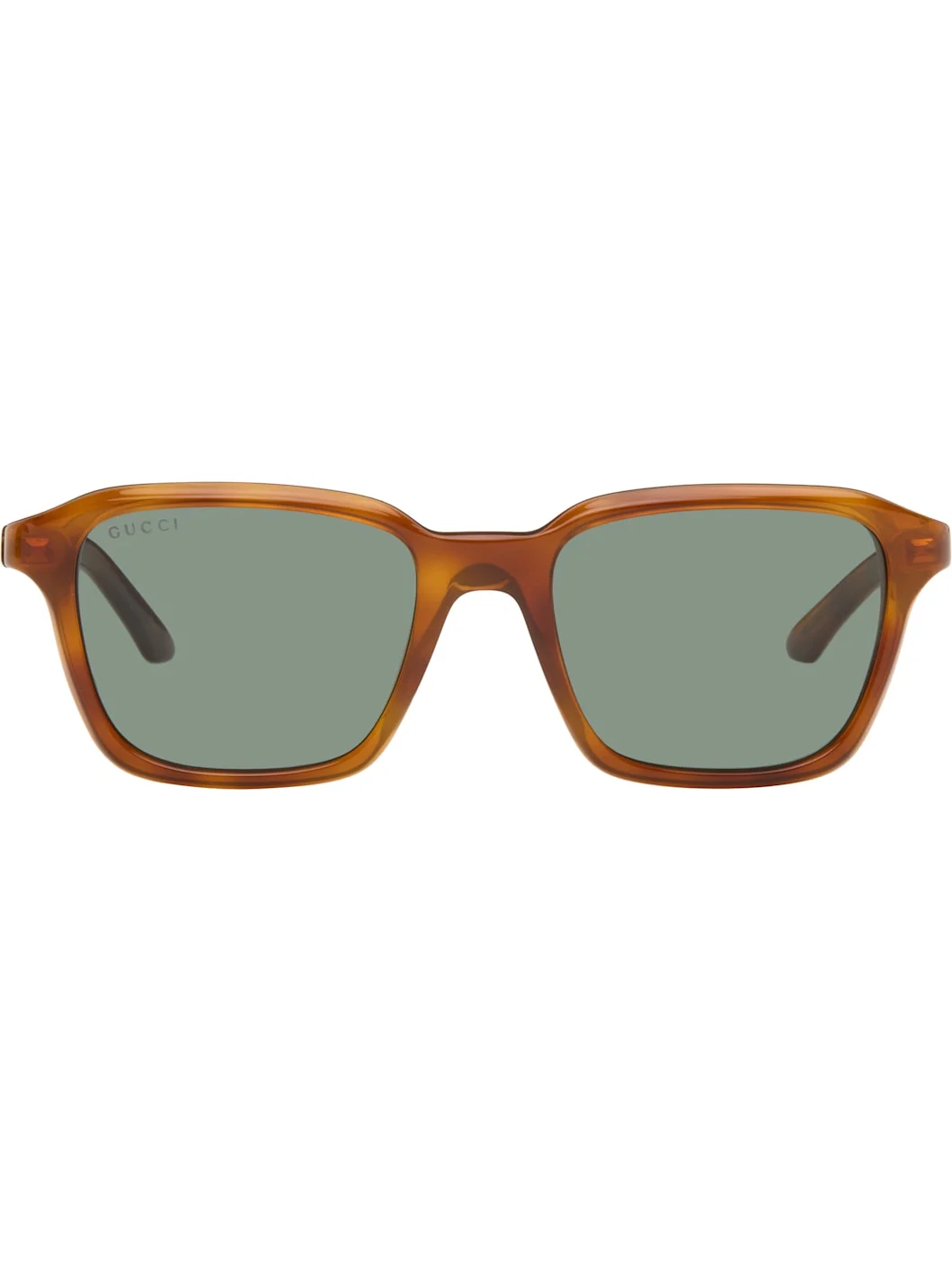 Square semi-transparent acetate-frame sunglasses. · Gray lenses · Logo etched at lens · Integrated nose pads · Inset logo plaque at temples · Core wires · Includes case · Size: 52.19 145 Supplier color: Havana/Havana/Green Acetate. Made in Italy 261451M134059