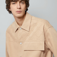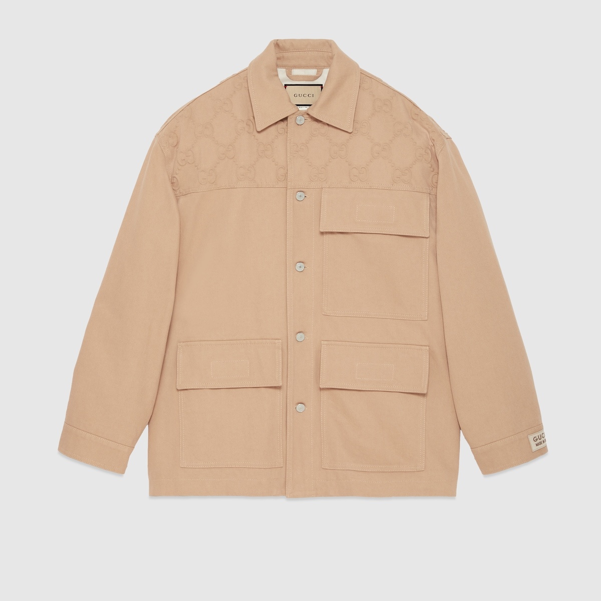 Earthy tones and muted shades of beige mix with vibrant touches of color to anticipate the arrival of a new season. Part of the selection, this jacket is crafted from beige organic denim and defined by the 'Gucci Made In Italy' label on the cuff. - Beige organic denim - 'Gucci Made In Italy' label on the cuff - Point collar - GG embossed detail - Long sleeves - Three front pockets - Button closure - Length: 31.1" based on a size 48 (IT) - Made in Italy - The product shown in this image is a size 48 (IT)