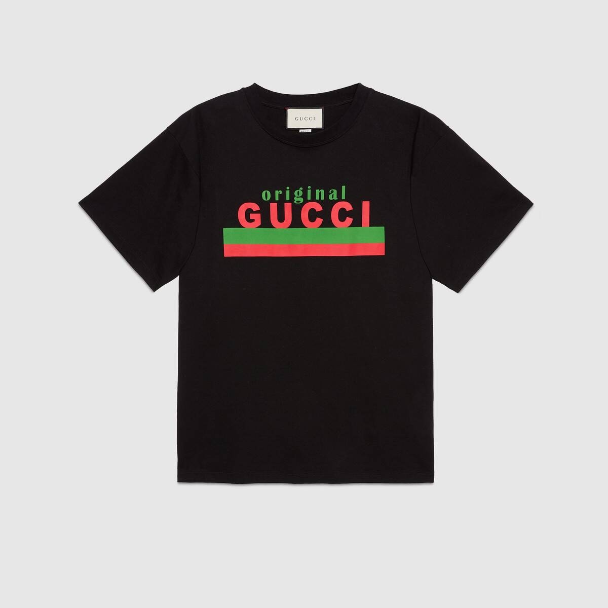 A statement print defines this oversize T-shirt, crafted from black cotton jersey and specifically washed for a vintage effect. The bold logo is shown throughout the Pre-Fall 2020 collection, featuring the “Original Gucci” motto and the House’s distinctive colors, green and red. - Washed black organic cotton jersey - Green and red "Original Gucci" print - This product contains organic cotton where the cultivation and manufacturing process restrict the use of chemicals, eliminate pesticides or artificial fertilizers and incorporate methods that respect biodiversity, improve soil quality, and reduce water consumption. - Crewneck - Oversize fit - Made in Italy - The product shown in this image is a size medium