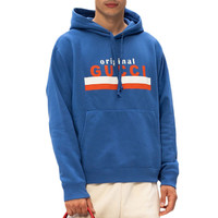 A statement print defines this hooded sweatshirt, crafted from blue heavy felted cotton jersey and specifically washed for a vintage effect. The bold logo is shown throughout the Pre-Fall 2020 collection, featuring the “Original Gucci” motto in a combination of white and orange. - Washed blue heavy felted organic cotton jersey - White and orange "Original Gucci" print - This product contains organic cotton where the cultivation and manufacturing process restrict the use of chemicals, eliminate pesticides or artificial fertilizers and incorporate methods that respect biodiversity, improve soil quality, and reduce water consumption. - Fixed hood - Front pocket - 100% organic cotton - Made in Italy - The product shown in this image is a size medium